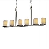 Limoges Montana Nickel & Pleats Porcelain ChandelierDescription: Limoges Collection, Montana Family - This collection brings fine translucent porcelain to the world of lighting. Designed and imported exclusively by Justice Design Group, LLC, each fixture reveals its delicately sculptured form and detail when illuminated. Nickel Finish Translucent Porcelain Shade Square shaped shade with a flat rim Pleats pattern Transitional Styling Specifications: 21" high x 52" wide x 7" deep Takes (6) 100-watt (max. each) standard bulbs (not included) Includes: 6' of chain 10' of wire Additional Information: Exceeds 50 pounds & requires joist (ceiling beam) mounting See the complete collection in "Related Items" (at the top of this box)!